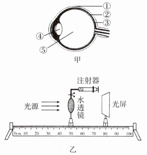 23. 为探究眼球的结构和成像原理,某生物学兴趣小组设计并制作了模型。图甲为眼球结构示意图,图乙为该模型装置,光源位置固定不变,注射器注水可使水透镜的曲度(凸度)增大。此时,图乙中光源发出的光经过水透镜折射,在光屏上形成了清晰的物像。下列说法正确的是( )