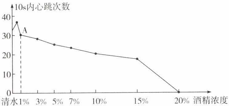 B.A 点表示酒精浓度为 1%时,水蚤 10s 内心跳次数为 30