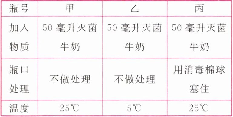 | 加入物质 | 50 毫升灭菌牛奶 | 50 毫升灭菌牛奶 | 50 毫升灭菌牛奶 |
