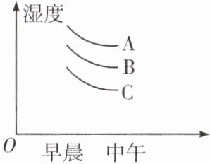 C 点拨:灌木丛植物相对丰富,蒸腾作用强,空气湿度大,A可能是灌木丛,该选项正确。从图中能看出不同环境中午湿度均比早晨低,因为中午温度高,蒸腾作用受影响等,该选项正确。如果实验在水源丰富的地方进行,水源蒸发会干扰空气湿度测量结果,所以应在自然状态、无额外水源干扰的环境测量,该选项错误。植物蒸腾作用能增加空气湿度,适当绿化有助于增加校园空气湿度,该选项正确。