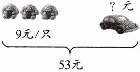 2. 如图,小明买玩具一共花了53元,他买了3只玩具兔子,已知每只玩具兔子9元,一辆玩具车多少元?