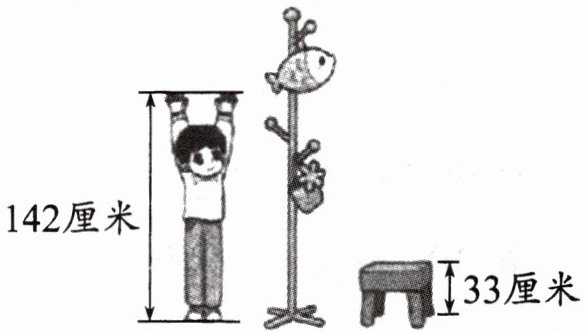 2. 玩具小鱼挂在离地面17分米高的位置,图中的小朋友能把玩具小鱼拿下来吗?说一说你的理由。(提示:可以用旁边的小凳子,但要注意安全哦)
