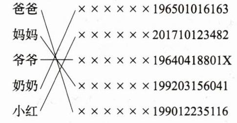红的身份证号码。请你连一连。|爸爸|××××××196501016163|