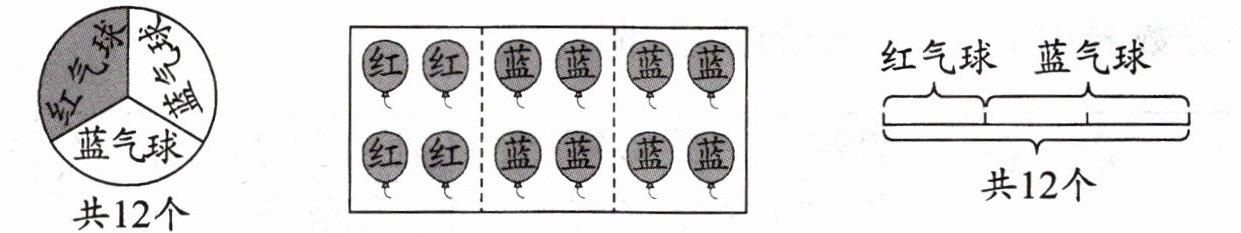 1. 有12个气球,其中$\frac{1}{3}$是红气球,$\frac{2}{3}$是蓝气球。下面能表示题目意思的图有几个?(