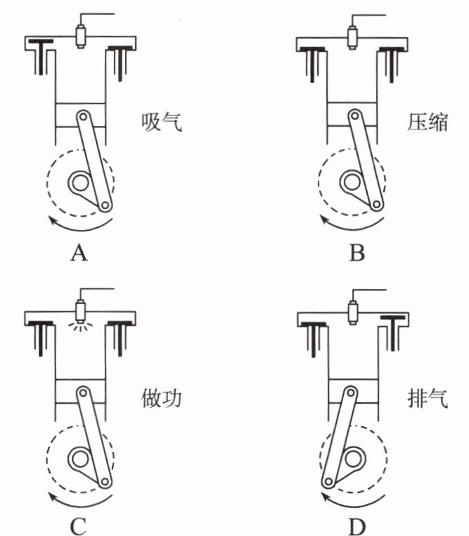 2. 某同学分别画出四冲程内燃机工作示意图中的吸气、压缩、做功、排气冲程。观察活塞和曲轴的位置和进气门、排气门的开闭情况,其中不正确的是(