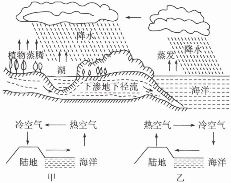 5. 如图所示是自然界的“水循环”示意图,地球上各种形态的水,在太阳辐射、地球引力等作用下周而复始地运动。由于地面和海洋升温和降温的快慢不同,使空气对流形成风,海边吹的陆风和海风统称“海陆风”。结合图像完成下面小题: