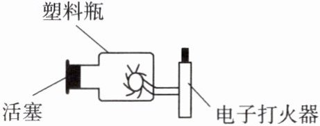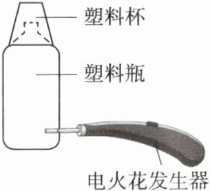 12. 如图所示是小明同学设计的“燃气内能转化”的实验装置。把电火花发生器紧紧塞进塑料瓶侧边的小孔中,往瓶中喷入雾状酒精,在瓶口上盖一个塑料杯,按动电火花发生器按钮后,观察到塑料杯向上飞起,这个过程中高温高压燃气的内能转化为塑料杯的