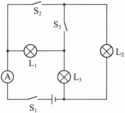 (2)当开关$S_1、$$S_2、$$S_3$都闭合时,灯泡$L_2$中的电流是1.6 A,电流表A的示数是2.4 A,此时灯泡$L_1$和$L_3$中的电流各是多少?