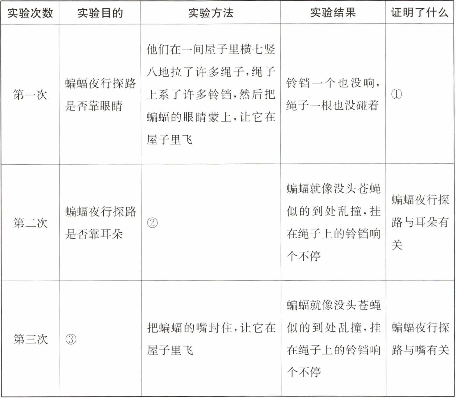 |第三次|③|把蝙蝠的嘴封住,让它在屋子里飞|蝙蝠就像没头苍蝇似的到处乱撞,挂在绳子上的铃铛响个不停|蝙蝠夜行探路与嘴有关|