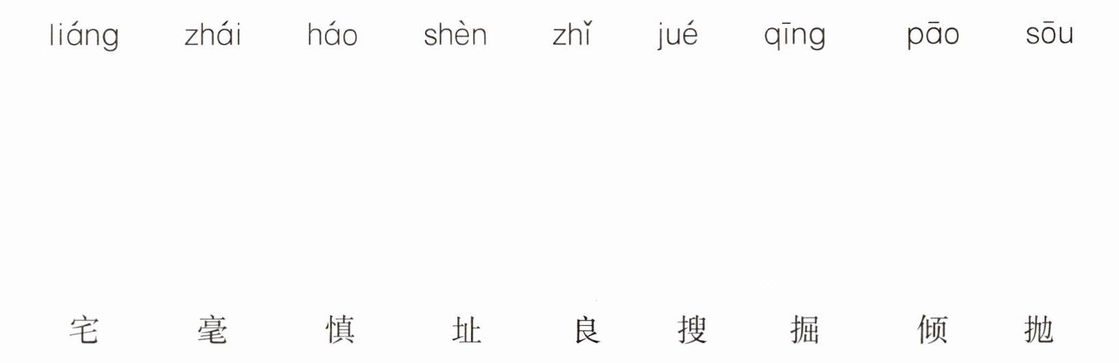 liáng—良;zhái—宅;háo—毫;shèn—慎;zhǐ—址;jué—掘;qīng—倾;pāo—抛;sōu—搜。