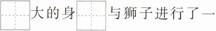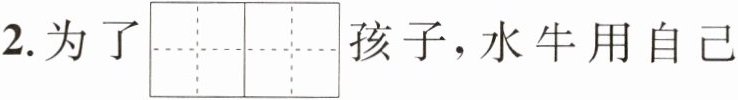 2. 为了 $\begin{array}{c} yǎn hù \\ \hline \end{array}\\ \hline $ 孩子,水牛用自己 $\begin{array}{c} páng \\ \hline \end{array}\\ \hline $ 大的身 $\begin{array}{c} qū \\ \hline \end{array}\\ \hline $ 与狮子进行了一场 $\begin{array}{c} bó dòu \\ \hline \end{array}\\ \hline $。