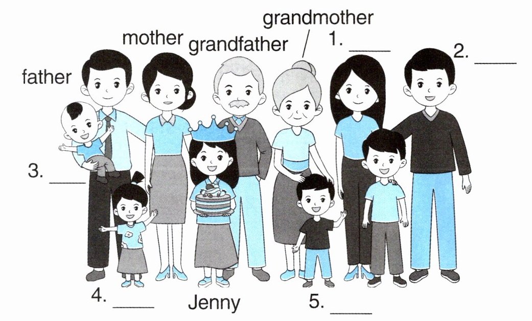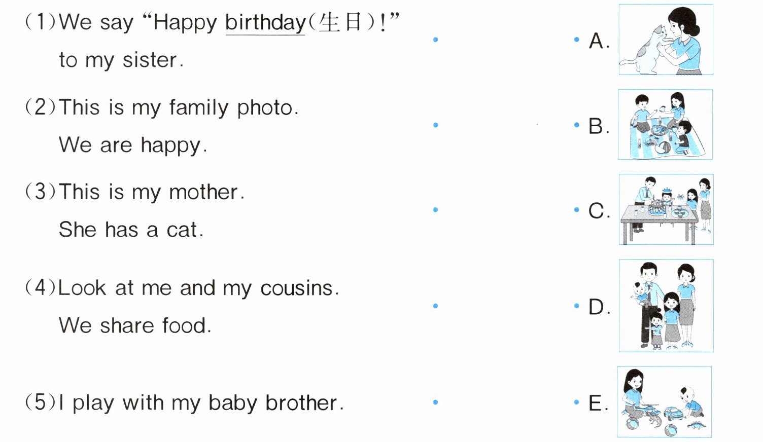 Jenny 的家人在为她庆祝生日,快来看看都有谁吧。 看图,选一选。
