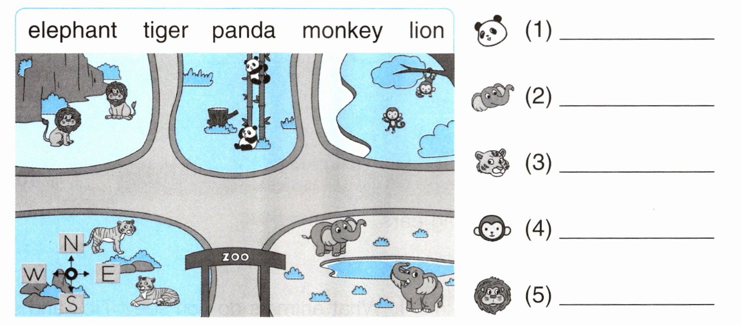 1. 选一选,写一写,完成动物园指示图。