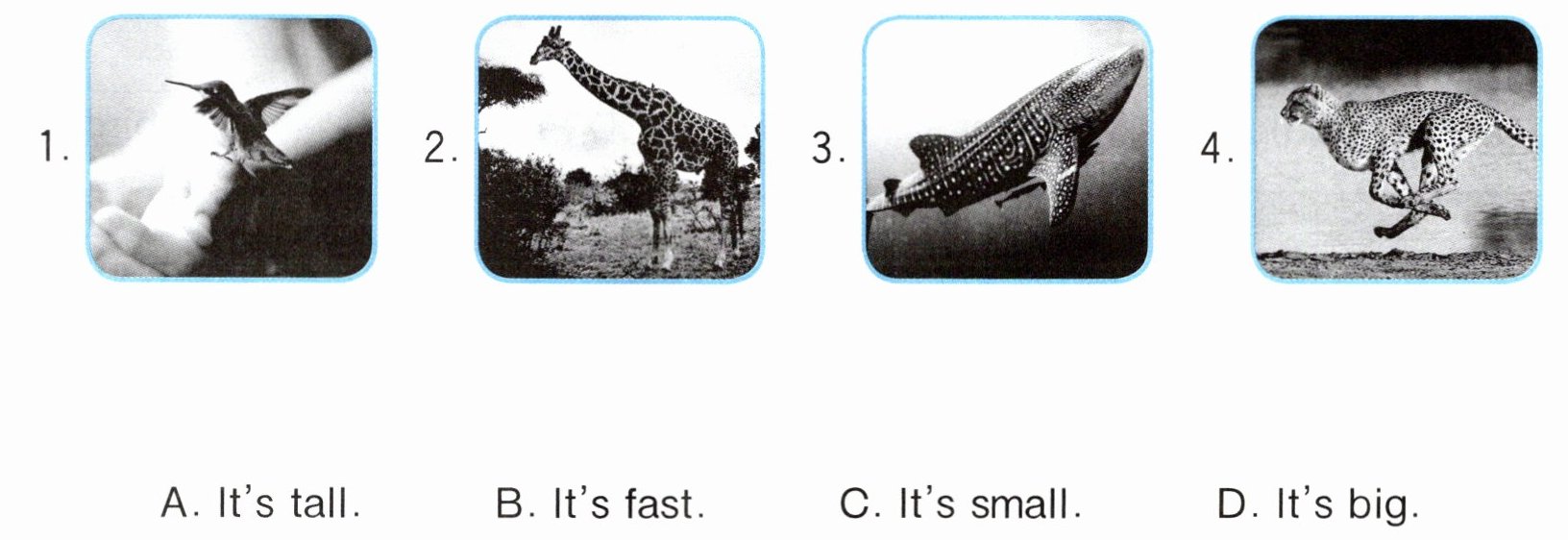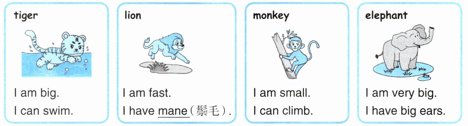 |I am big.I can swim. |I am fast.I have mane (鬃毛). |I am small.I can climb. |I am very big.I have big ears. |