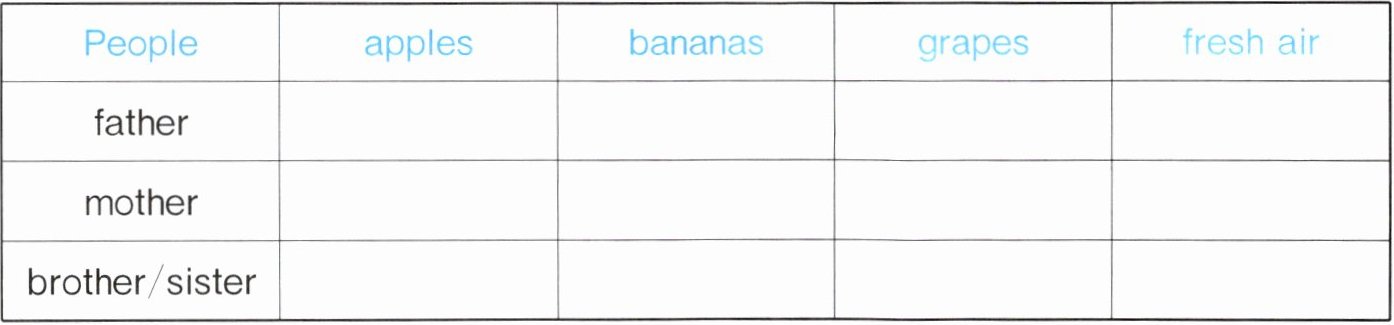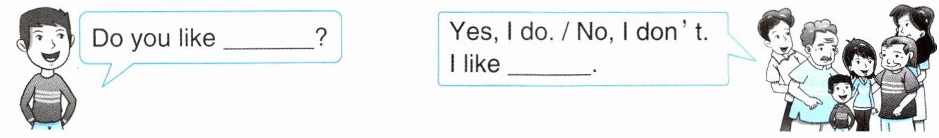 1. 使用句型"Do you like ______?"依次询问father, mother, brother/sister对apples, bananas, grapes, fresh air的喜好;2. 根据回答"Yes, I do."在对应表格内画笑脸,"No, I don't."则不画;3. 示例中插图2句型"I like ______."用于确认喜好内容。