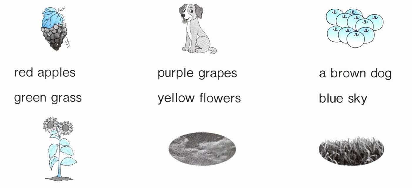 1. 葡萄一purple grapes;小狗一a brown dog;苹果一red apples;向日葵一yellow flowers;天空一blue sky;草一green grass