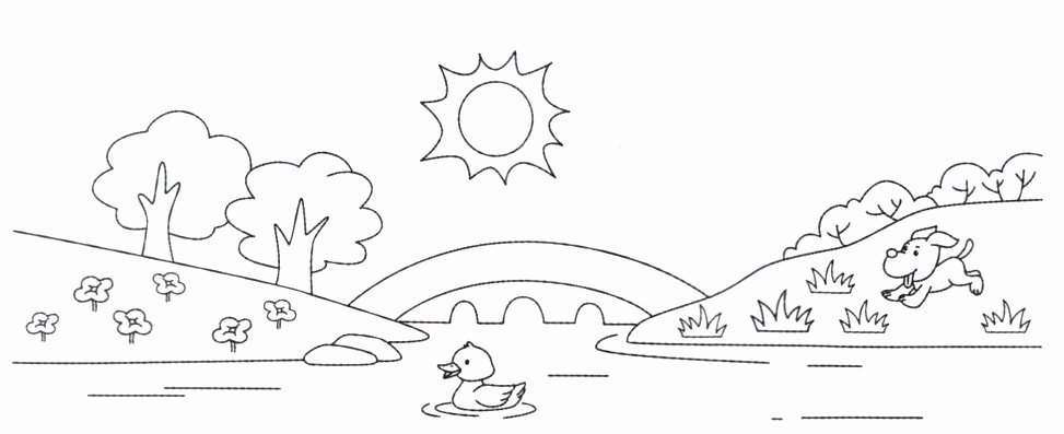 太阳涂橙色;鸭子涂黄色;狗涂棕色;草涂绿色;花涂紫色;树涂绿色