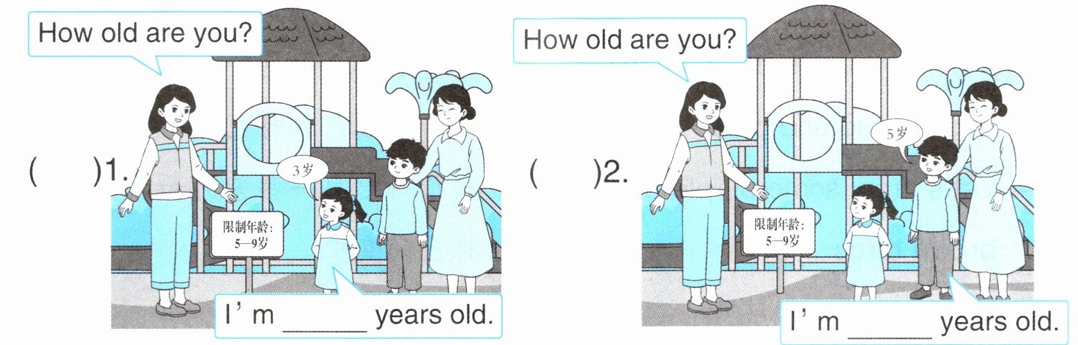 毛毛和妹妹妞妞去游乐场玩。 观察图片,补全对话,并判断他们是(√)否(×)能玩这个滑梯。
