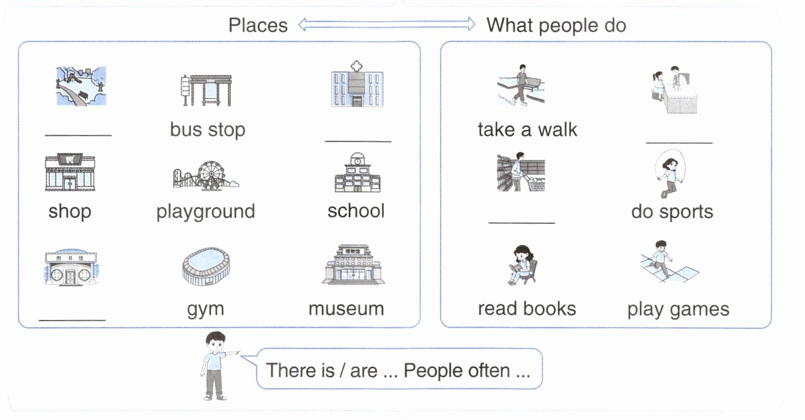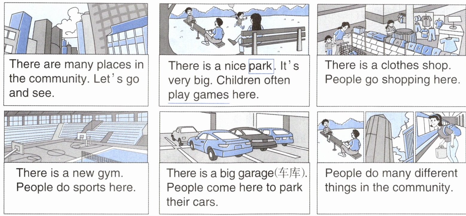 任务一:用方框框出绘本中的场所设施,用横线画出活动类词组。