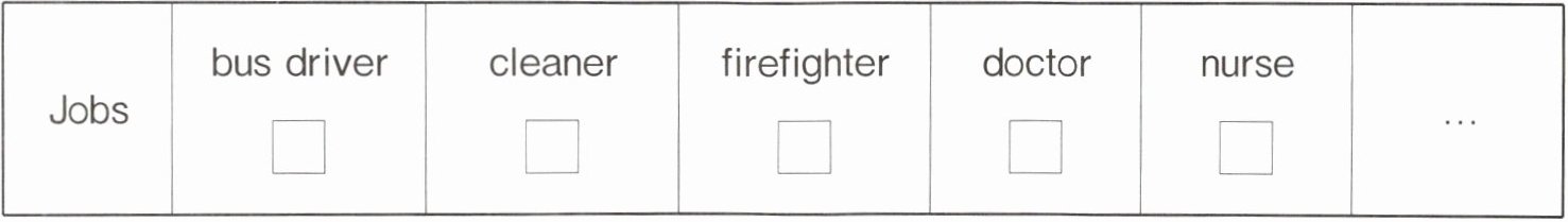 | Jobs | bus driver | cleaner | firefighter | doctor | nurse |... |