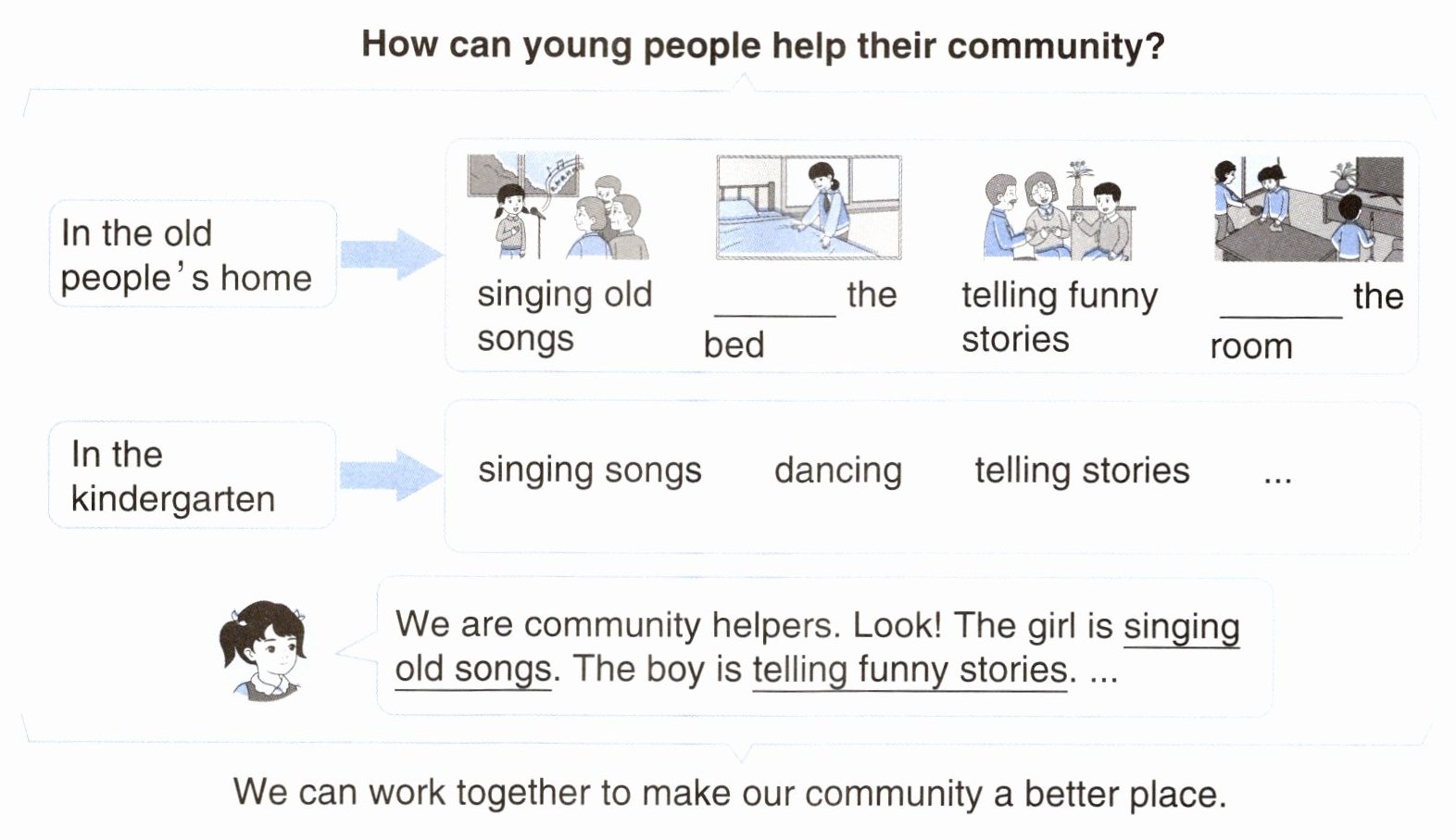 Many workers and helpers make our community better and better. They help in the community. Look! Cleaners are cleaning toilets and parks. Doctors are looking after sick people. The school bus driver is taking students to school. Cooks are cooking delicious food. And look at the community helpers! Some are helping in the kindergarten and some are in the old people’s home. They are singing, dancing, cleaning the room, making the bed, telling stories and playing games. They make people happy. They are happy too.