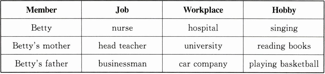 Betty is a nurse. She works in a hospital. She likes singing very much. Betty's mother is a head teacher. She works in a university. She likes reading books. Betty's father is a businessman. He works in a car company. He likes playing basketball. They are a happy family.