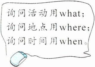 询问活动用 what;询问地点用 where;询问时间用 when。