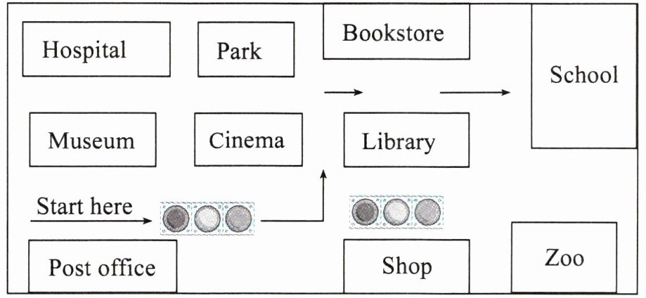 at the second traffic lights(交通信号灯). Go straight again and turn right