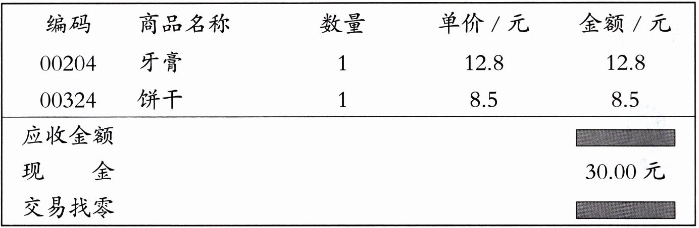 3. 朵朵到超市买了两样东西。根据下面这张购物小票,朵朵付给收银员 30 元,还能找回多少钱?