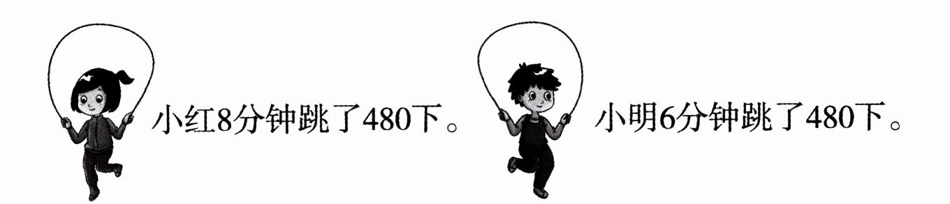 根据公式$速度 = 总量÷时间$,小红$8$分钟跳了$480$下,那么小红每分钟跳的次数为$480÷8 = 60$(下),即$v_{红}=\frac{480}{8}=60$(下/分钟)。