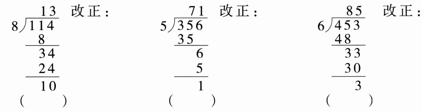 ×;改正:$\begin{array}{r}14\\8\enclose{longdiv}{114}\\ \underline{8}\\34\\\underline{32}\\2\end{array}$