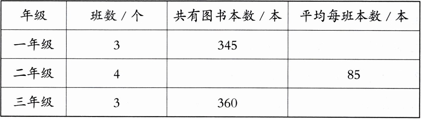 |年级|班数/个|共有图书本数/本|平均每班本数/本|