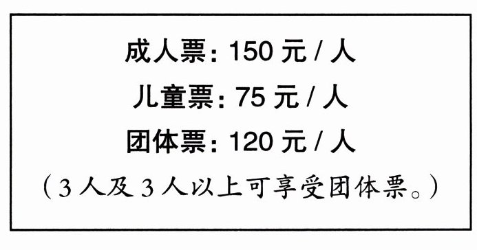 国庆长假期间,明明跟爸爸、妈妈一家三口到游乐场游玩。他们来到购票大厅,看到如图所示的购票信息。明明一家怎么买票合算?请用算式表示出你的思考及推理过程。