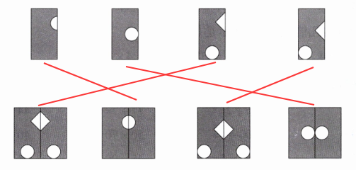 五、把 4 张正方形纸对折,剪成下图,展开后分别得到哪一个图形?连一连。