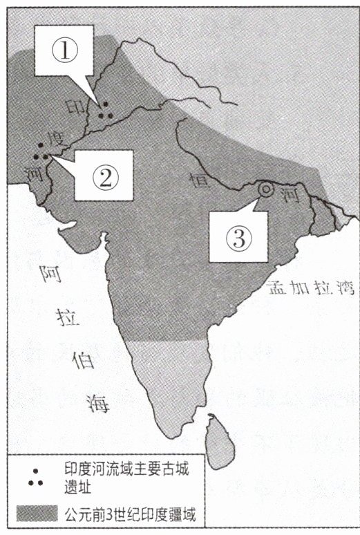 指示的地点。(2)简述孔雀王朝的鼎盛局面。