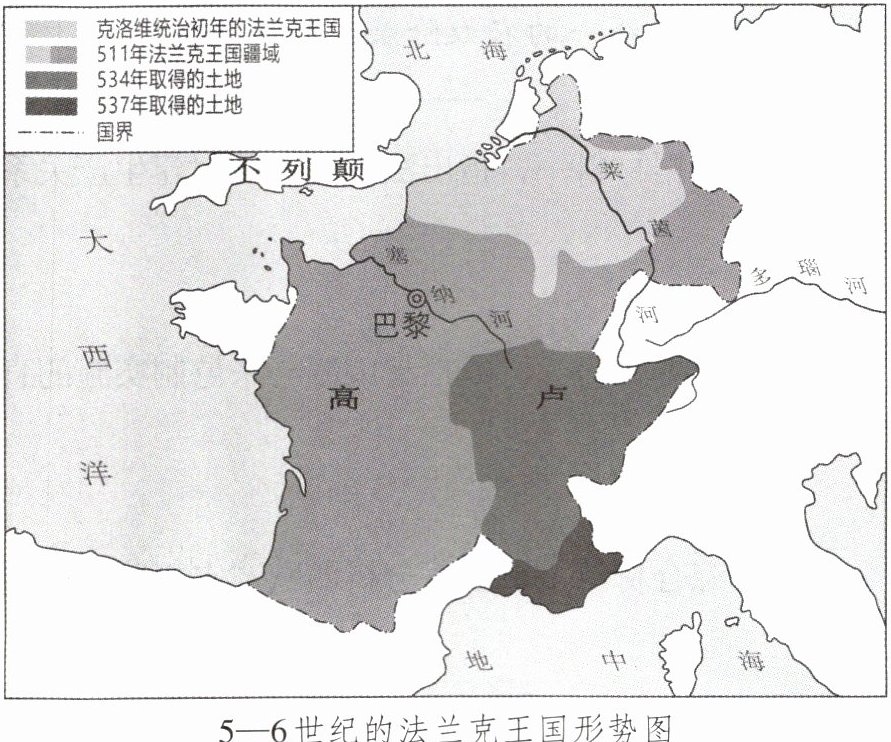 9. 仔细观察下面历史地图,概述5—6世纪法兰克王国版图扩张的情况。