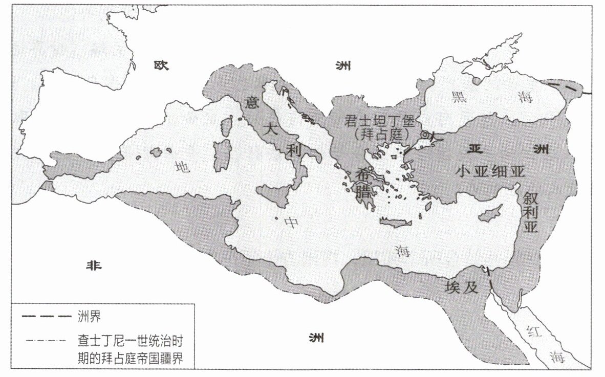 (1)请用颜色笔描出查士丁尼一世统治时期的拜占庭帝国疆界。