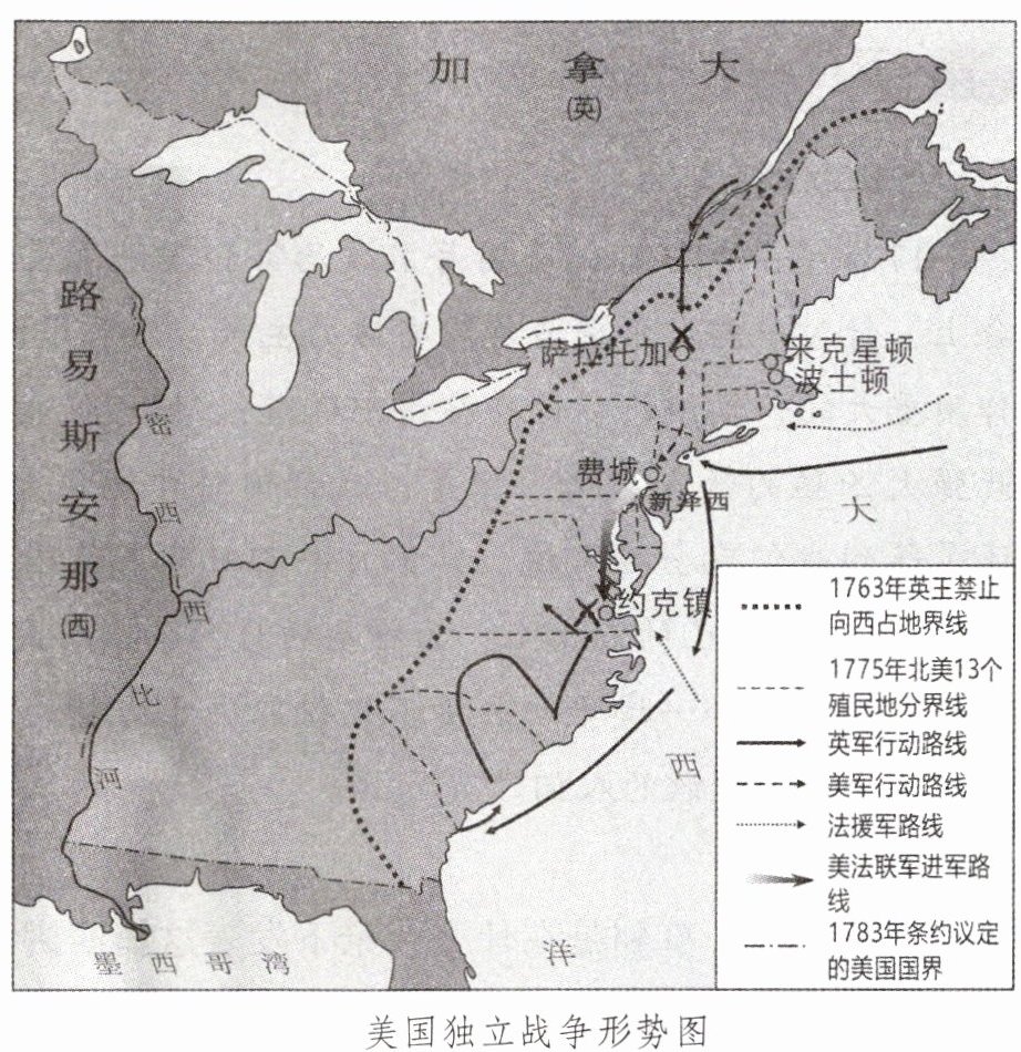 7. 右图中的地点,在美国独立战争中均具有重要地位。请从中选择一个地点,简述该地所发生的历史事件对美国独立战争的影响。