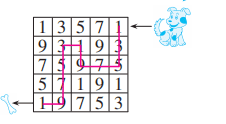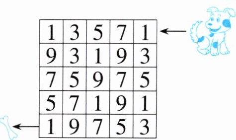 8. 小狗按“1,3,5,7,9,1,3,5,7,9……”的顺序走才能啃到骨头。它可以怎么走?用线画出来。