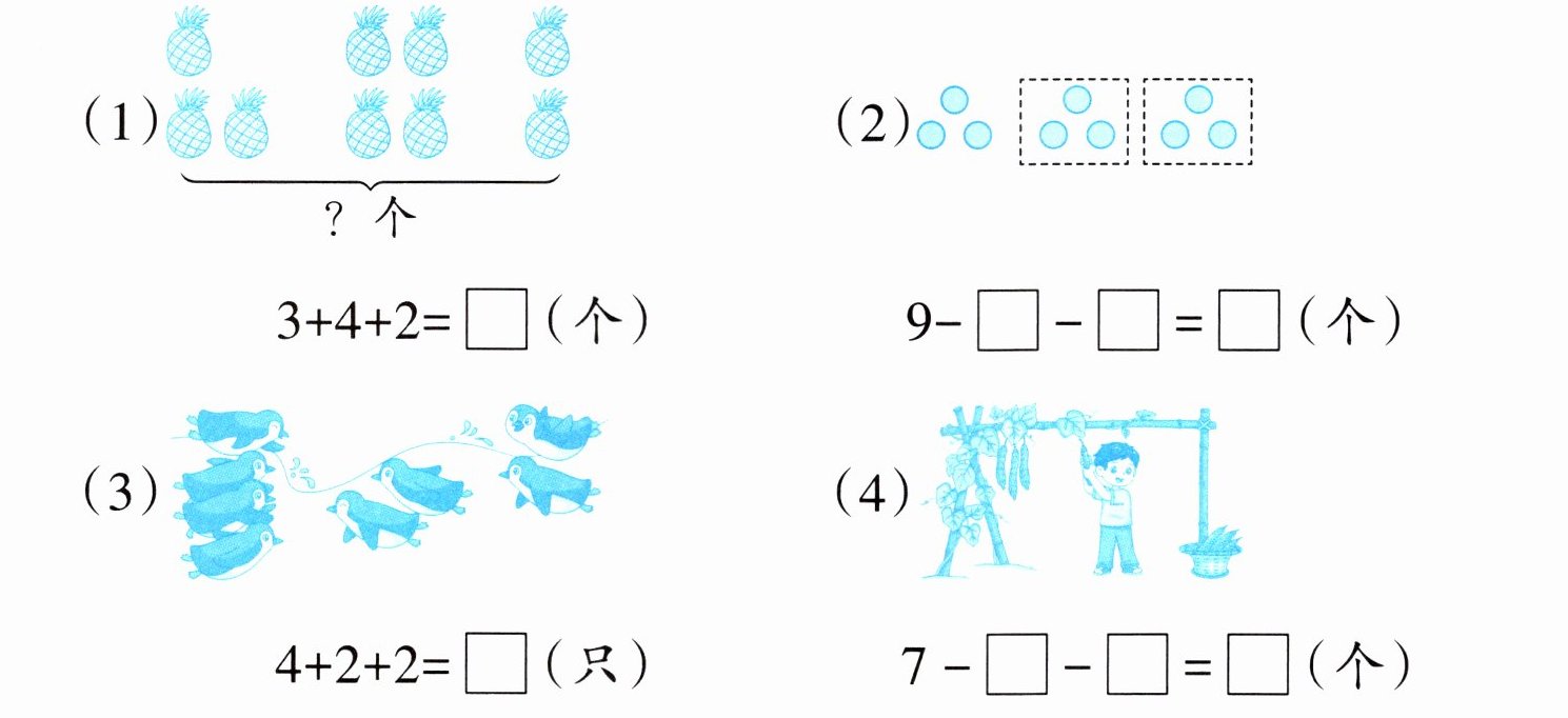 4. 原来有( )只燕子,先飞走了( )只,又飞走了( )只,还剩多少只?