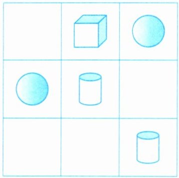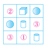 请在图中空白处填图形的序号,使每一横行、每一竖列都有、和。
