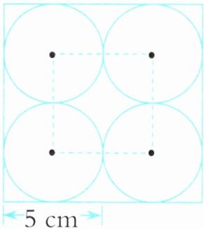 上图的大正方形中有4个相同的圆,每个圆的半径是(2.5cm),直径是(5cm)。小正方形的边长是(5cm),大正方形的边长是(10cm)。