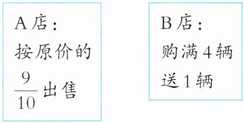 2. 乐乐和他的 4 个好朋友约好星期天到玩具店购买 5 辆相同的玩具车,玩具车的单价是 20 元。以下两家店,到哪家店购买合算?