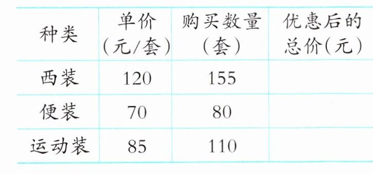 3.服装城按购买服装的多少,享受不同的优惠:50~100套按原价的$\frac{9}{10}$计算,101~150套按原价的$\frac{8}{10}$计算,151~200套按原价的$\frac{7}{10}$计算。 种类 单价(元/套) 购买数量(套) 优惠后的总价(元) 西装 120 155 13020 便装 70 80 5040 运动装 85 110 7480
