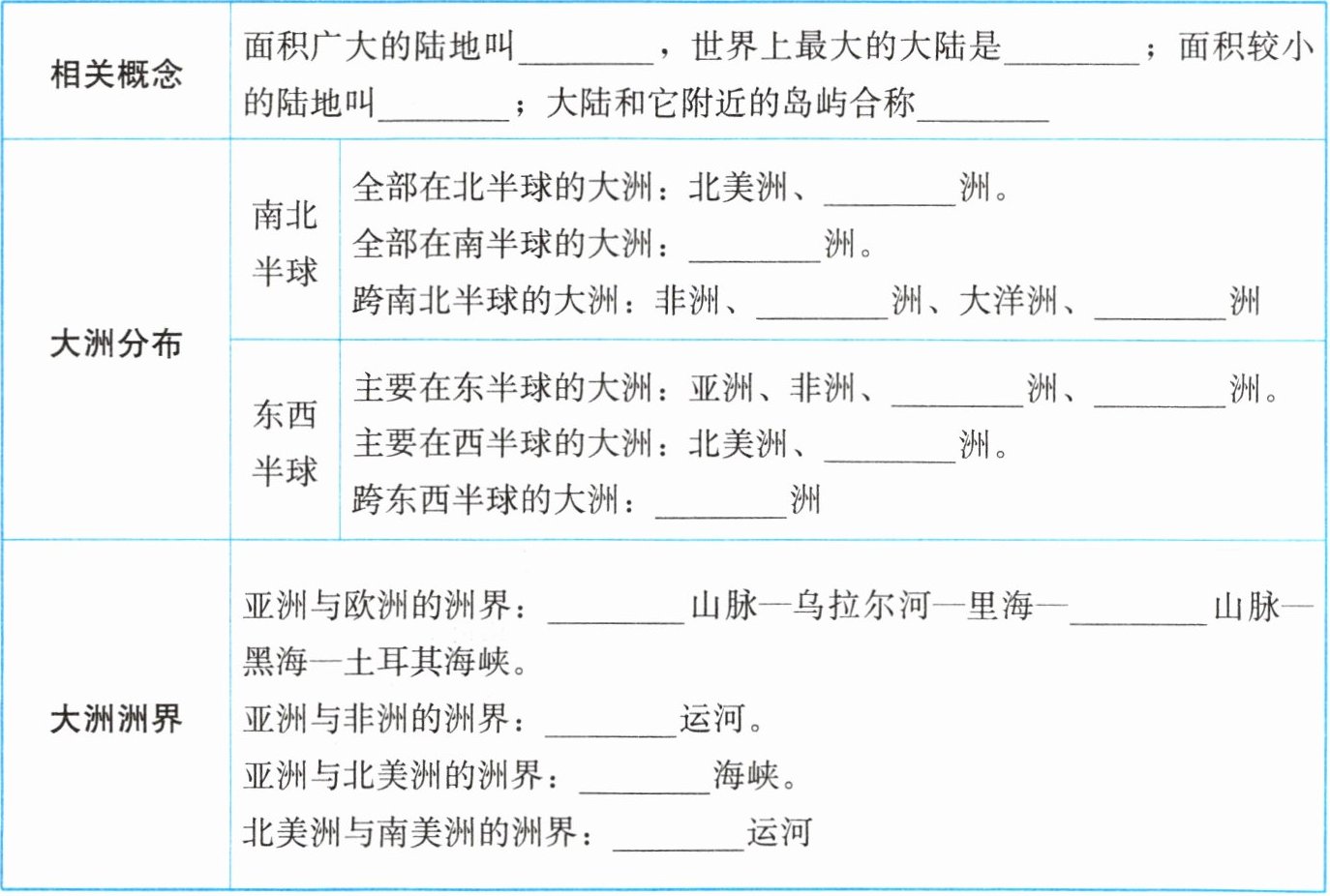 要点二:大陆;亚欧大陆;岛屿;大洲;欧;南极;亚;南美;欧;大洋;南美;亚;乌拉尔;大高加索;苏伊士;白令;巴拿马