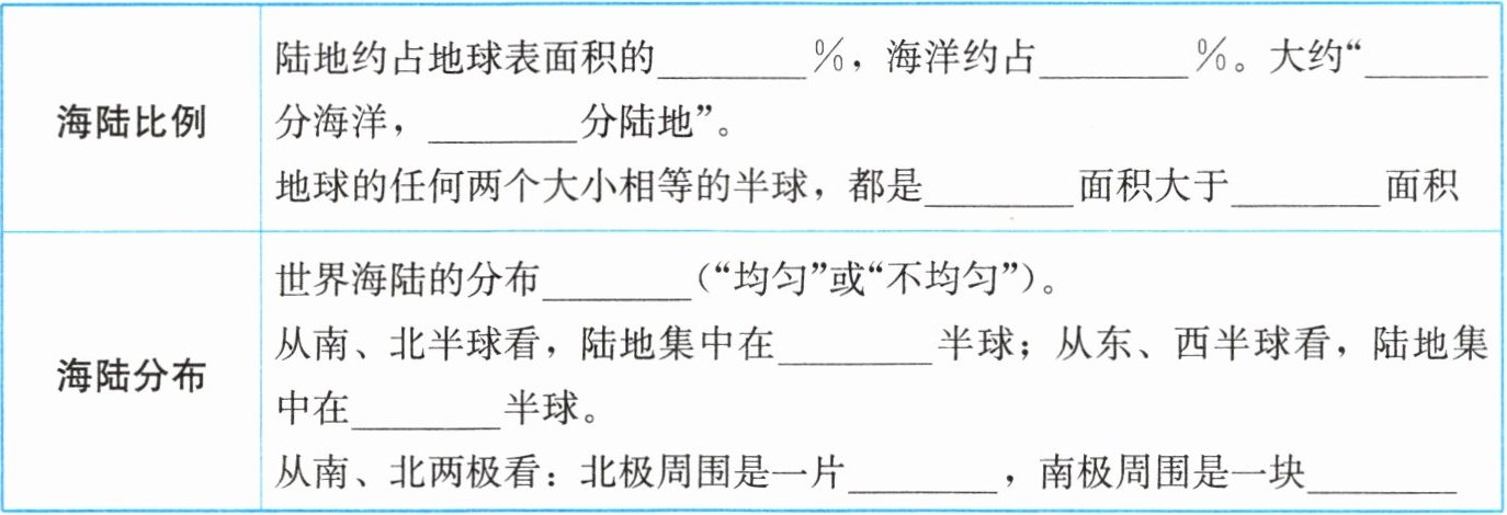 要点一:29;71;七;三;海洋;陆地;不均匀;北;东;海洋;陆地