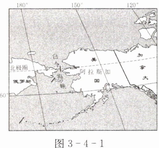 (2022江西)白令海峡位于亚欧大陆与北美大陆之间, 东临美国的阿拉斯加。读图3-4-1白令海峡及其周边区域图,完成1~2题。