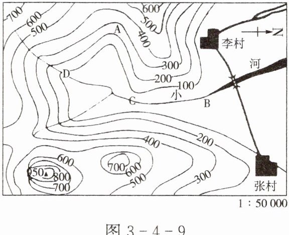 18.(2023湖北黄冈)某中学地理研学小组准备去李村、张村附近进行野外考察,出发前查阅了当地的等高线地形图。读图3-4-9李村、张村附近等高线(单位:米)地形图,回答下列问题。