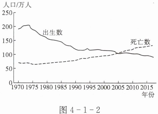 3. 图4-1-2示意某国人口出生数与死亡数变化曲线,据此完成3~5题。