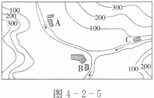 (1)聚落可以分乡村和城镇两大类,按照这种划分,图4-2-5中A、B、C三处聚落属于